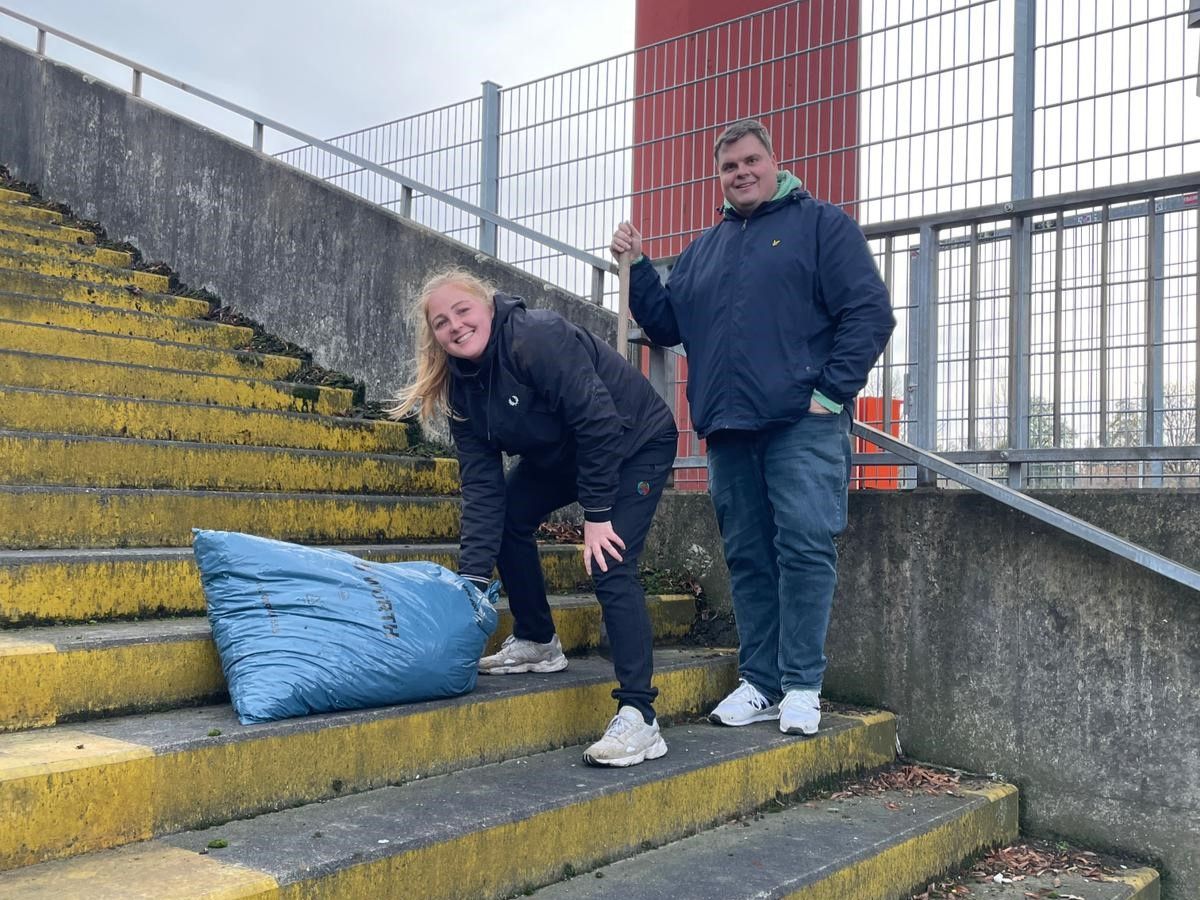 Auf der West- und Osttribüne wurde Unkraut und Moos entfernt sowie Laub zusammengetragen und entsorgt. Bereich für Bereich wurde freigelegt, damit die Tribünen wieder ein sauberes und gepflegtes Bild abgeben. Auch unter den Tribünen wurde begonnen, kräftig aufzuräumen: Erste Bereiche wurden entrümpelt, gesäubert und neu sortiert. Mit Kaffee, Glühwein, Gebäck und Pizza stärkten sich die Aufräum-Trupps. „Sensationell, was unsere Fans hier wieder geleistet haben. Danke für diese super Aktion“, so KFC-Geschäftsführer Sebastian Schmidt vor Ort.