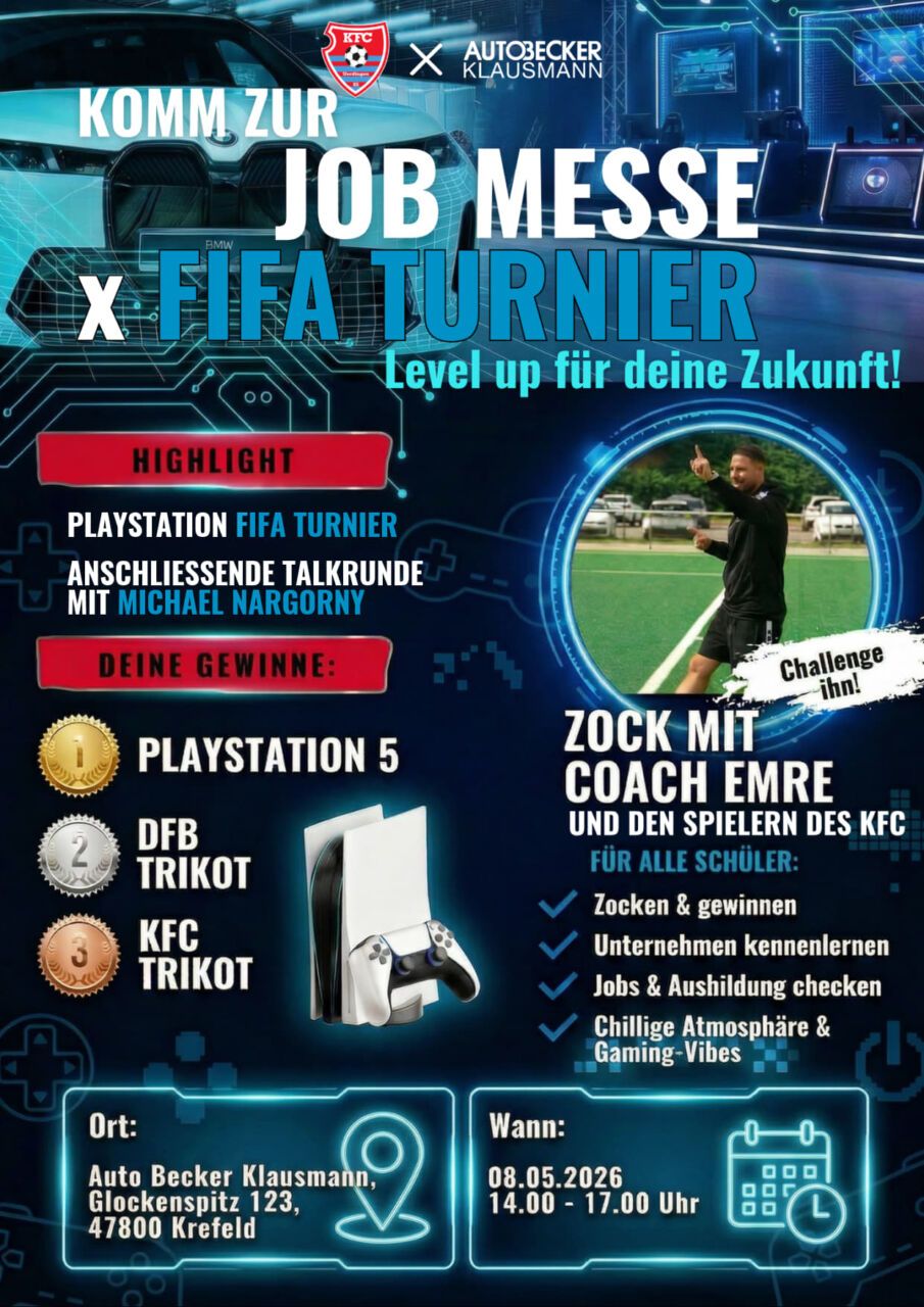 Die Azubi- & Jobmesse von Auto Becker Klausmann und des KFC Uerdingen am Freitag, 8. Mai, wirft ihre Schatten voraus. Unter dem Motto „Level up für deine Zukunft“ geht es ab 14 Uhr im neu umgebauten Autohaus von Auto Becker Klausmann am Glockenspitz 123 los. Zielgruppe sind Schüler, Studenten und Berufsanfänger, aber auch Personen, die sich für einen Jobwechsel interessieren – und natürlich Gamer mit Skills an der Konsole.